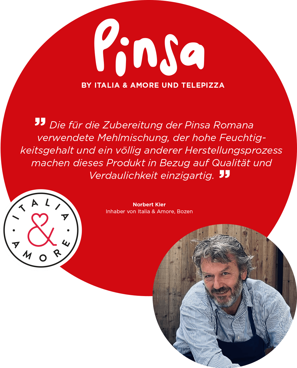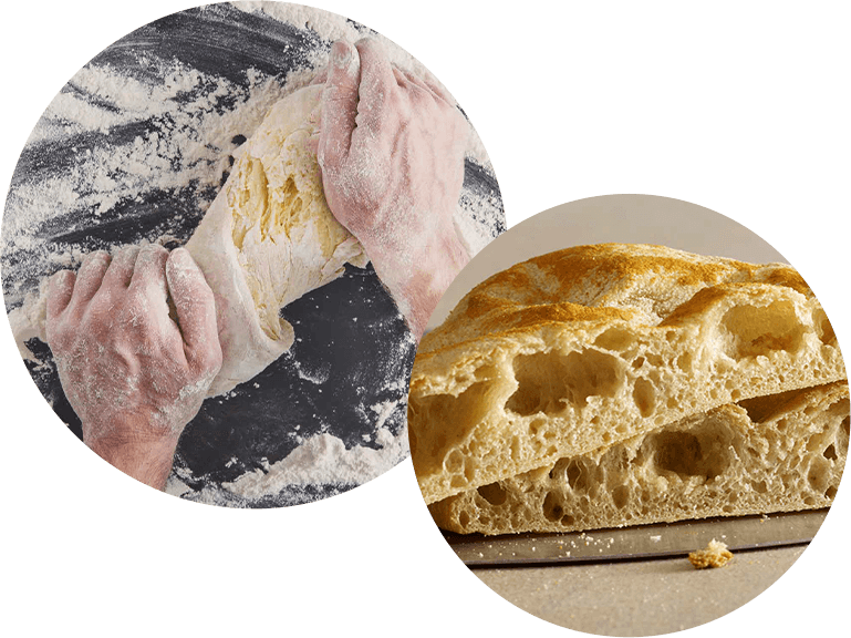 Unser Pinsa-Teig ist ein waschechter Italiener. Er wird nach Original-Rezepten über 72 Stunden immer wieder von Hand geknetet. Durch diesen aufwändigen Herstellunsprozess wird die Pinsa später außen knusprig, innen weich und unvergleichlich bekömmlich.